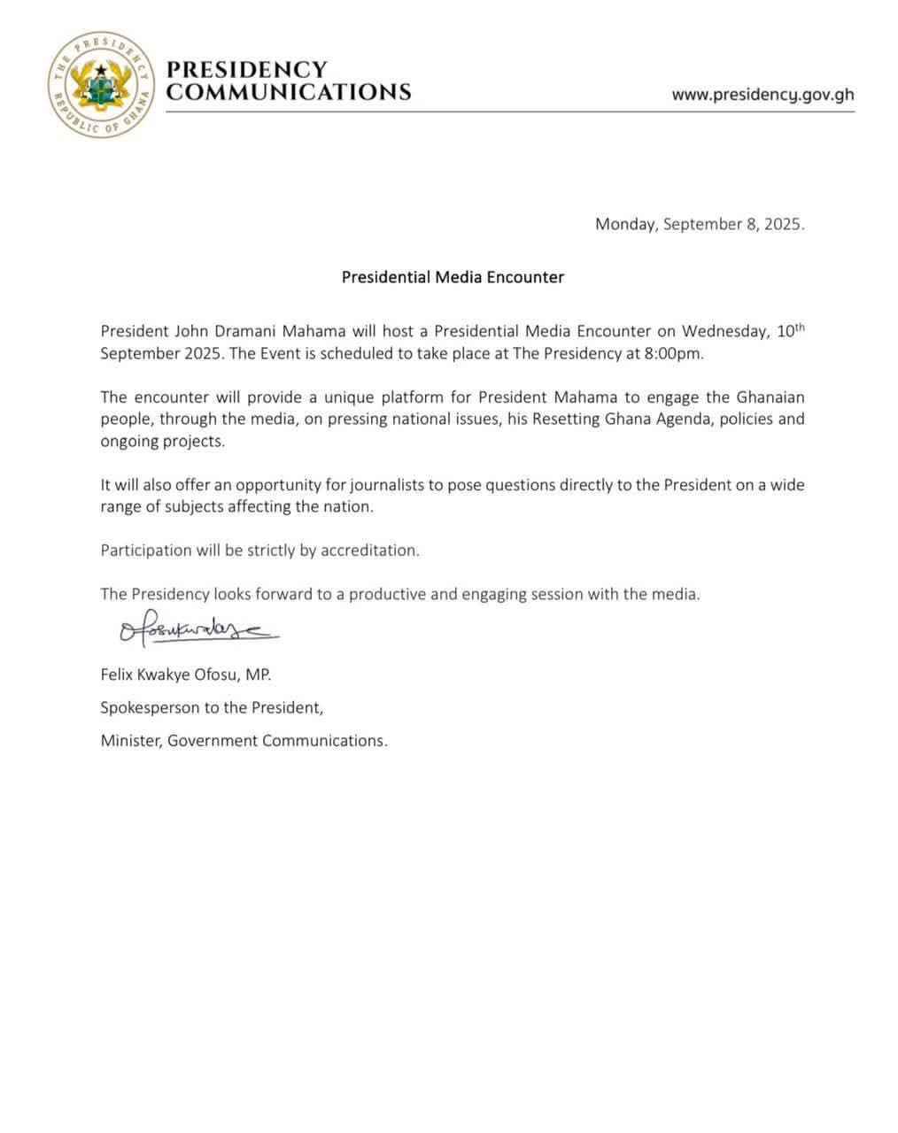 The Presidency has announced that President John Dramani Mahama will host a Presidential Media Encounter on Wednesday, September 10, 2025.