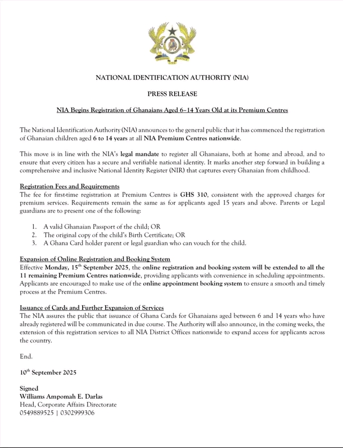 The National Identification Authority (NIA) has commenced the registration of Ghanaian children aged six to fourteen years for the Ghana Card at all Premium Centres nationwide.