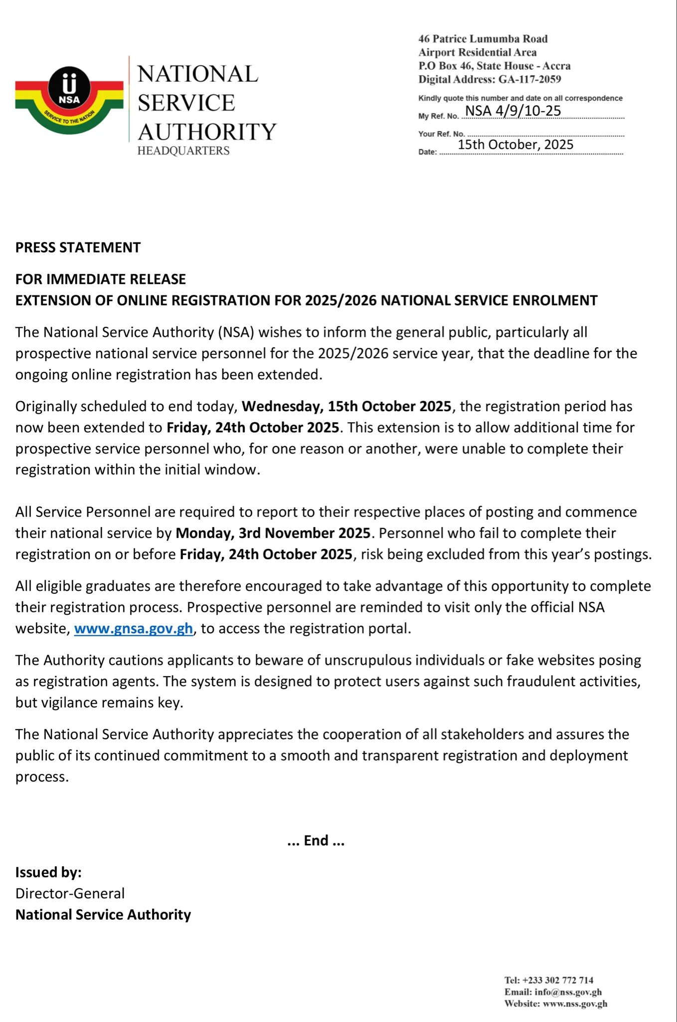 The National Service Authority (NSA) Headquarters has extended the deadline for online registration for the 2025/2026 National Service Enrolment.