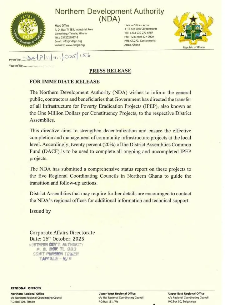 The Northern Development Authority (NDA) has announced the transfer of all Infrastructure for Poverty Eradication Projects (IPEP), under the One Million Dollars per Constituency initiative, to the respective District Assemblies.
