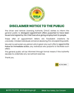 The Driver and Vehicle Licensing Authority (DVLA) has announced that the general public should disregard appointment offers purportedly issued and signed by the Chief Executive for employment purposes.