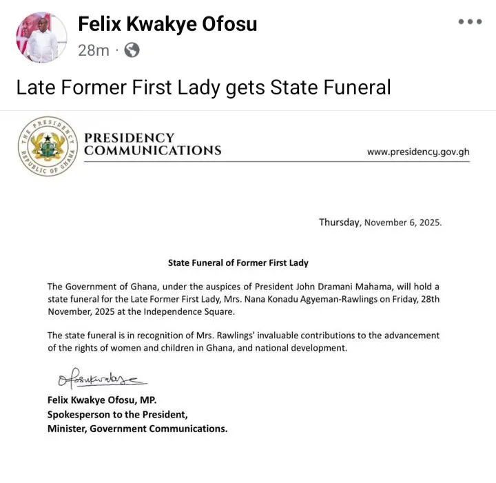 The government has announced that the state funeral for the late Former First Lady, Mrs. Nana Konadu Agyeman-Rawlings, is scheduled to take place on Friday, November 28, 2025, at Independence Square in Accra.