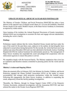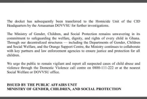 In an update issued by the MoGCSP on Friday, November 7, 2025, upon learning of the incident, the Ashanti Regional Directorate of Gender immediately initiated follow-up investigations to ascertain the facts and engage relevant stakeholders, including the victim’s family.