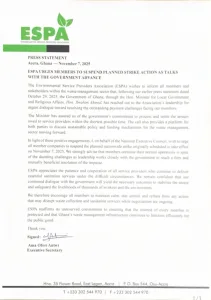 The Environmental Service Providers Association (ESPA) has announced the suspension of its planned nationwide strike, following talks with the government.