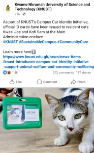 Kwame Nkrumah University of Science and Technology (KNUST) has launched a unique Campus Cat Identity Initiative.