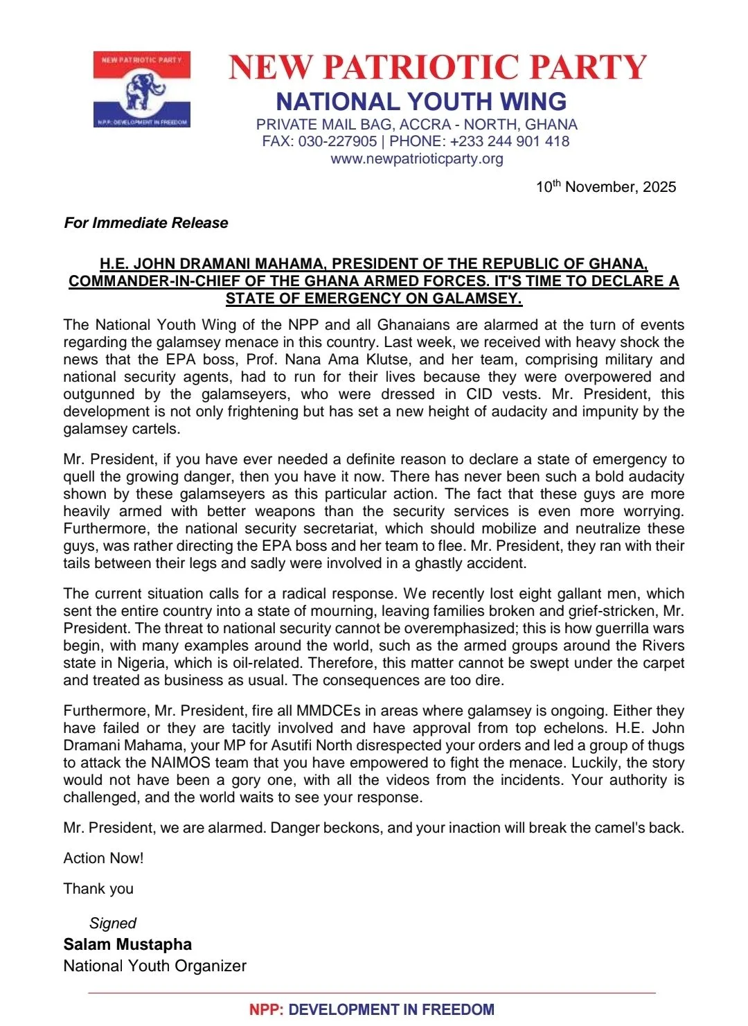 “This situation,” the statement continued, “demonstrates a total breakdown of state control in galamsey affected areas and demands immediate, decisive presidential action.”