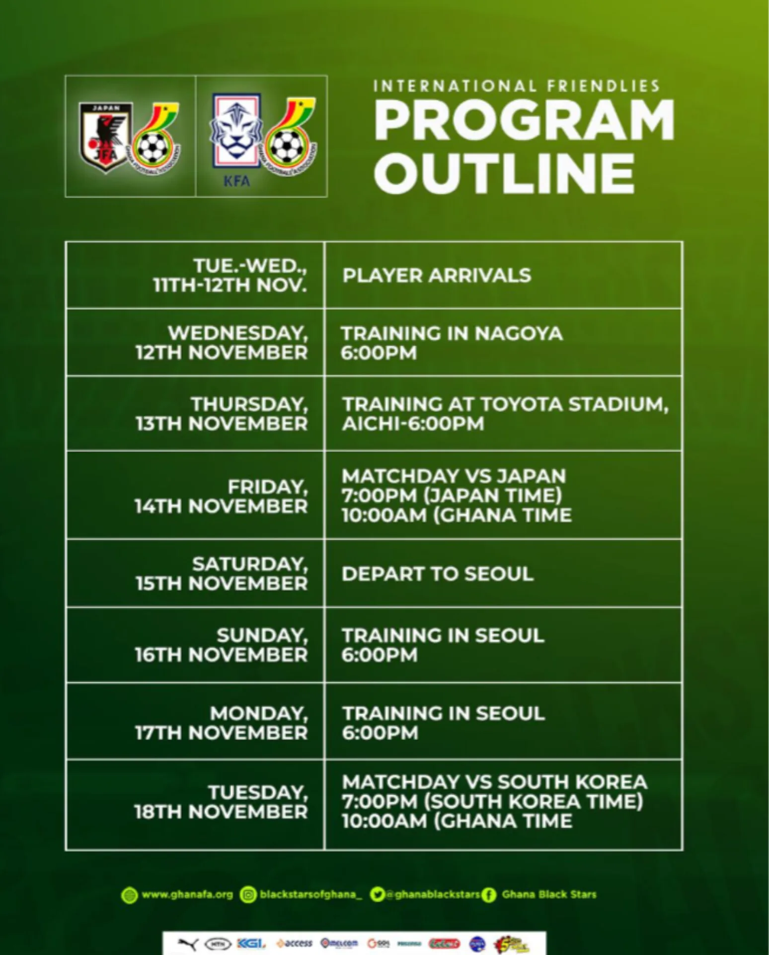 Ghana will face Japan on Friday, November 14, before traveling to Seoul to take on South Korea on Tuesday, November 18, 2025.