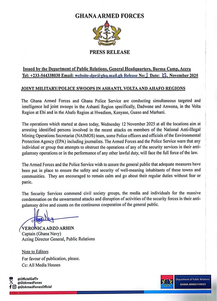 According to a statement issued by the Department of Public Relations of the Ghana Armed Forces (GAF), the operations, commenced at dawn on Wednesday, November 12, 2025.