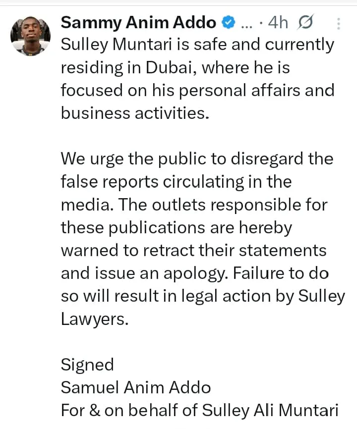 “Sulley Muntari is safe and currently residing in Dubai, where he is focused on his personal affairs and business activities,” he said.