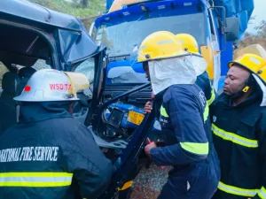 The Ghana National Fire Service (GNFS) has rescued 16 people after a head-on collision between a Ford Transit (AS 7172-23) and a Kia Rhino (AS 3058-X) at Nyamebekyere on the Sunyani-Kumasi highway earlier Tuesday, November 18, 2025.