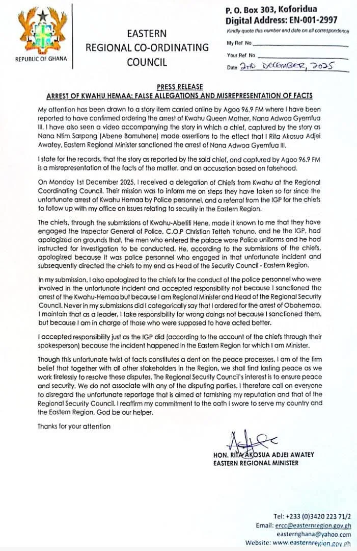 According to her, on December 1, 2025, a delegation of Kwahu chiefs visited the Regional Coordinating Council to brief her on steps taken following the arrest of the QueenMother by police personnel.