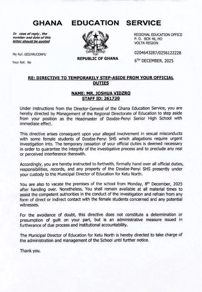 In a letter dated December 6, 2025, and issued by the Volta Regional Directorate of Education, Mr. Vidzro was instructed to hand over all official duties, responsibilities, and school property to the Municipal Director of Education for Ketu North.