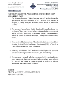 According to a press release issued by the Public Affairs Unit of the Regional Police Headquarters on Monday, December 8, the suspects demanded a ransom of GH₵ 100,000 from the victim’s family in exchange for his release.