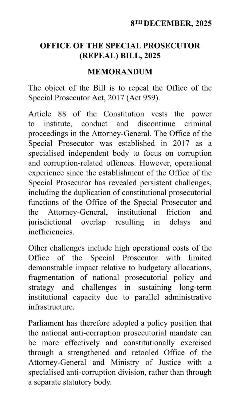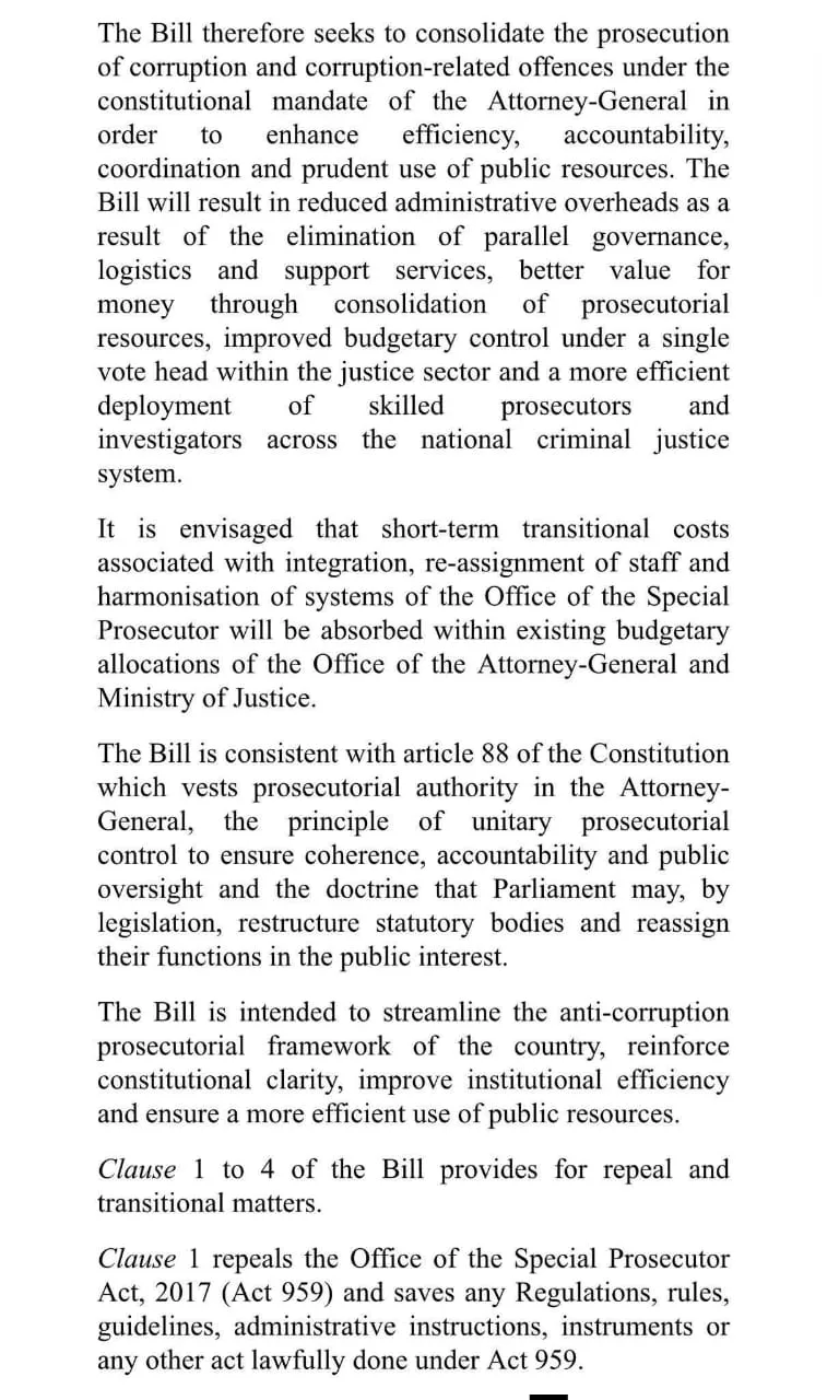 In a memorandum accompanying the bill sighted bt this portal, cites Article 88 of the Constitution, which vests prosecutorial authority in the Attorney-General, as the legal basis for the proposed repeal.