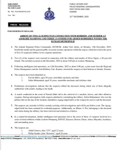 In a press release issued by the Ghana Police Service (GPS) on Monday, December 15, 2025, two of the suspects were arrested for the robbery and murder of 28‑year‑old Silver Ngosi, a female victim at Asokore Mampong.
