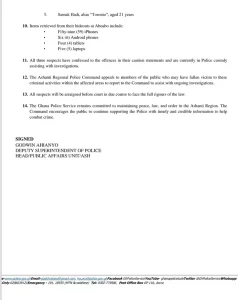 The Ashanti Regional Police Command urges members of the public who may have been victims of these crimes to report to the Command to aid ongoing investigations.