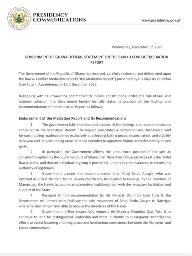 The Government further respectfully requests that His Majesty Otumfuo Osei Tutu II continue to lend his distinguished leadership and moral authority to subsequent reconciliation efforts aimed at fostering enduring peace and harmonious coexistence between the Mamprusi and Kusasi communities.