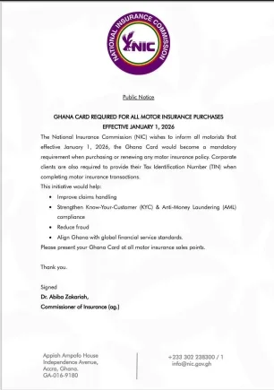 “The National Insurance Commission (NIC) wishes to inform all motorists that effective January 1, 2026, the Ghana Card would become a mandatory requirement when purchasing or renewing any motor insurance policy,” the notice stated.