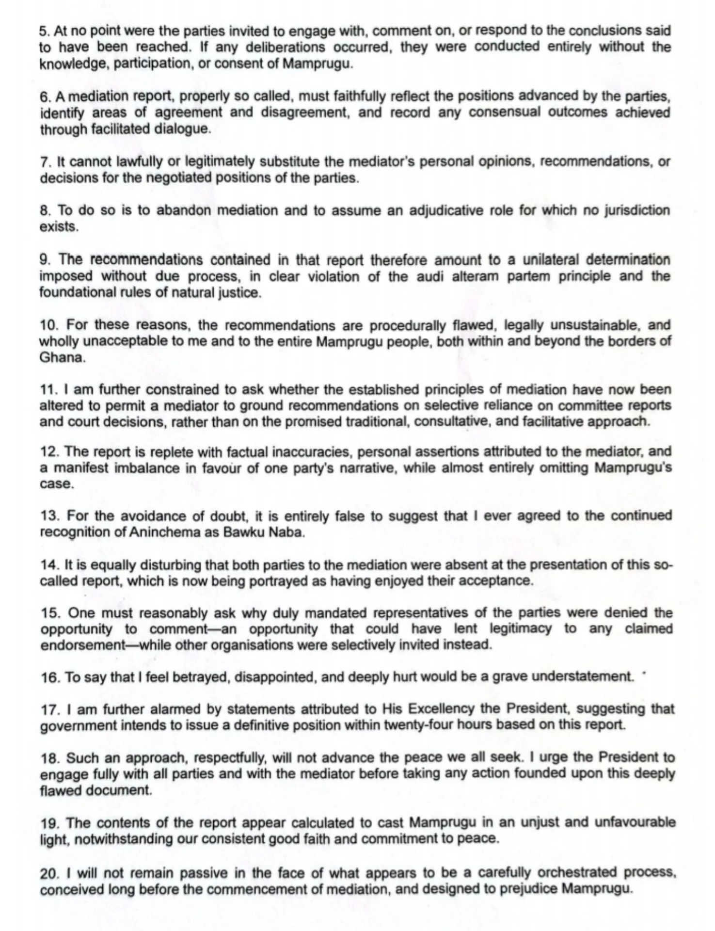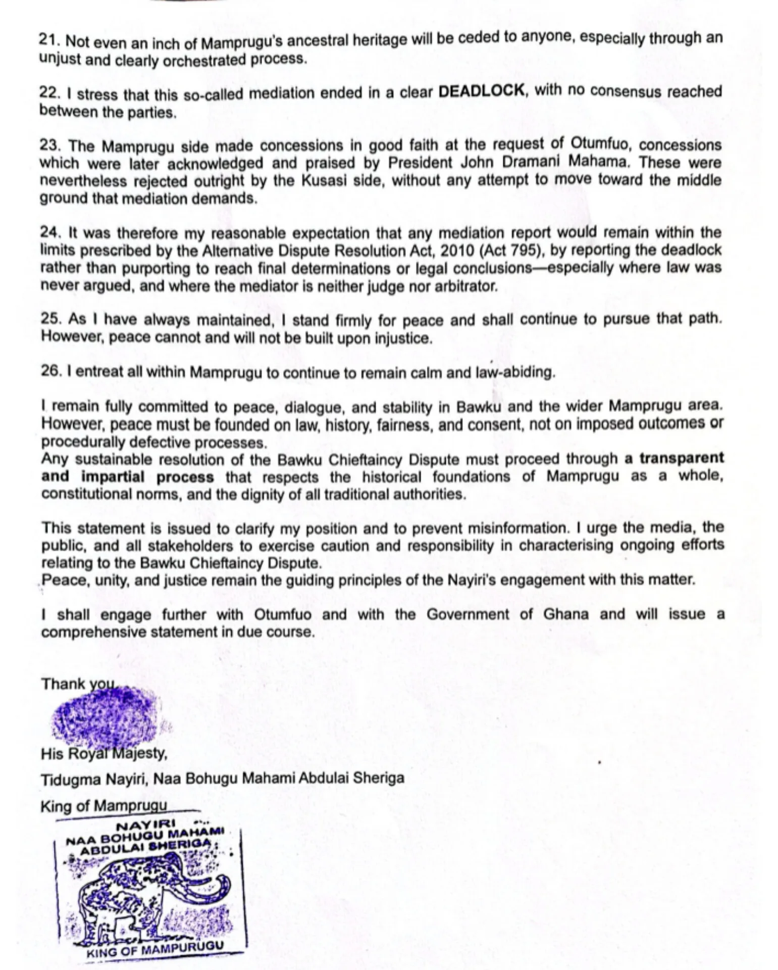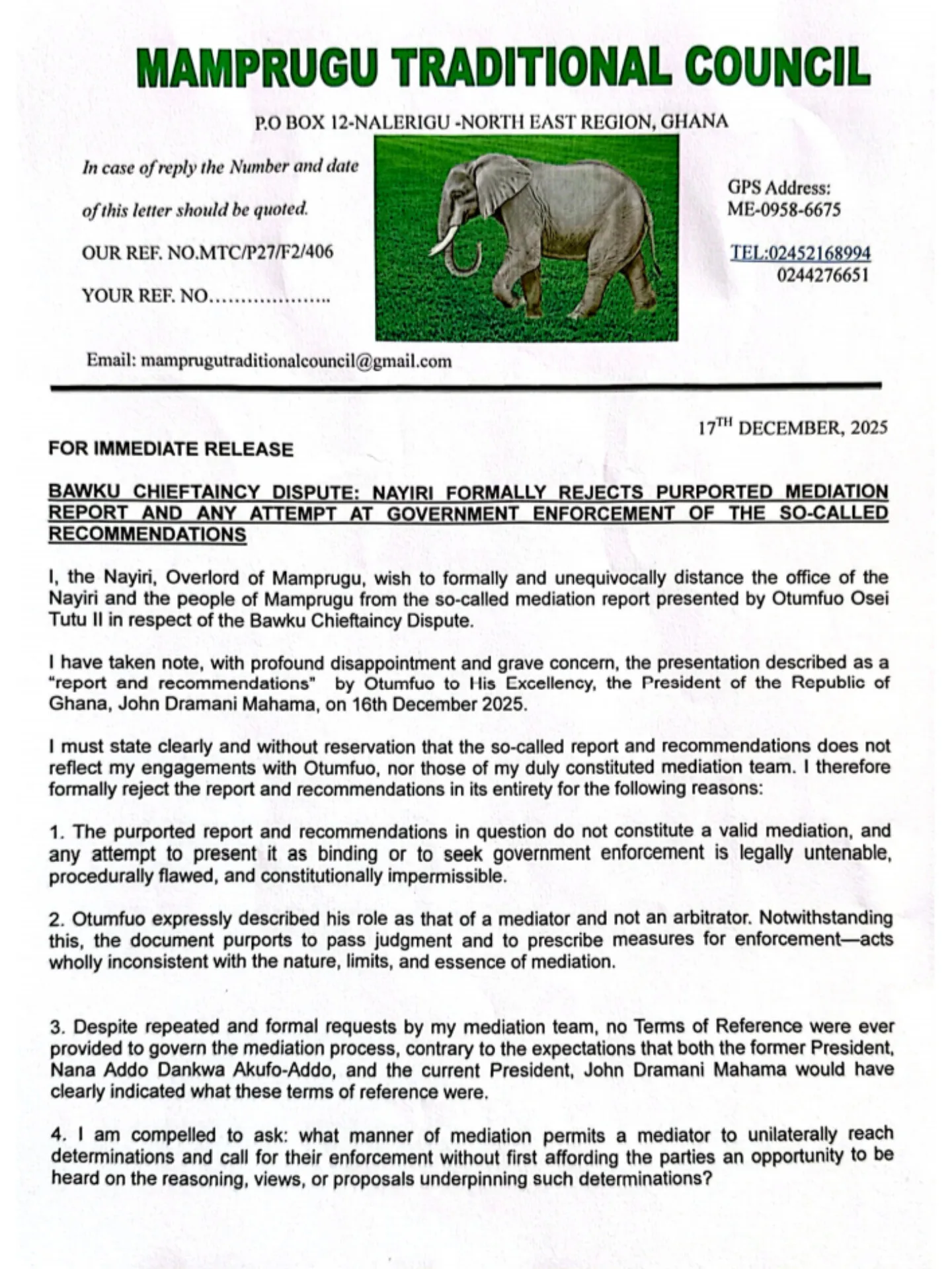 In a statement issued on December 17, 2025, His Royal Majesty, Tidugma Nayiri, Naa Bohugu Mahami Abdulai Sheriga, the Overlord of Mamprugu, distanced himself and the people of Mamprugu from the report, stressing that it does not reflect the engagements held with the mediator.