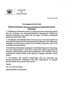 The Ministry of Education has notified all teachers across Ghana that the Controller and Accountant-General’s Department (CAGD) has completed processing and paying two types of teacher allowances scheduled for November 2025.
