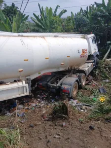 The incident is believed to have occurred after a tyre detachment caused the tanker to lose control and collide with the Sprinter bus, which ended up beneath the tanker.