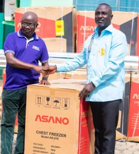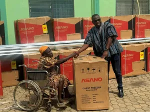 The items include chest freezers, fridges, fufu machines, cement, roofing sheets, provisions, sewing machines, and an electronic wheelchair, among other livelihood support items.