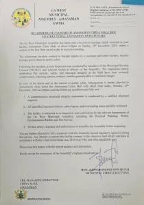 The Ga West Municipal Assembly has ordered the immediate closure of China Mall over severe fire safety violations following a blaze that injured a customer on Sunday, December 28, 2025.