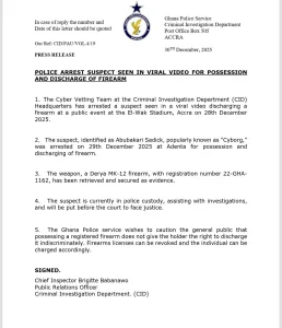According to the press statement signed by the Public Relations Officer of the Criminal Investigation Department (CID), Chief Inspector Brigitte Babanawo “the suspect, identified as Abubakari Sadick, popularly known as “Cyborg,” was arrested on 29th December 2025 at Adenta for possession and discharging of a firearm adding that a Derya MK-12 firearm, with registration number 22-GHA-1162, has been retrieved and secured as evidence.”