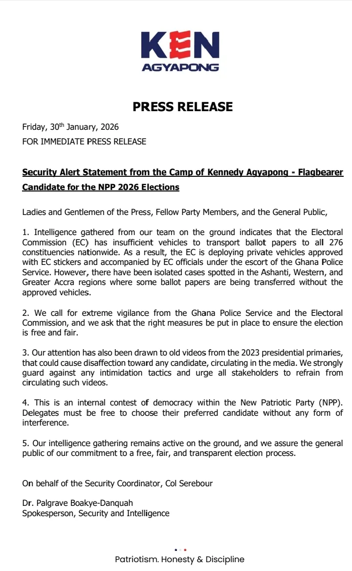 The campaign team of New Patriotic Party (NPP) flagbearer aspirant Kennedy Agyapong has raised security and logistical concerns ahead of the party’s internal presidential election, calling on the Electoral Commission (EC) and the Ghana Police Service to take urgent steps to protect the integrity of the process.