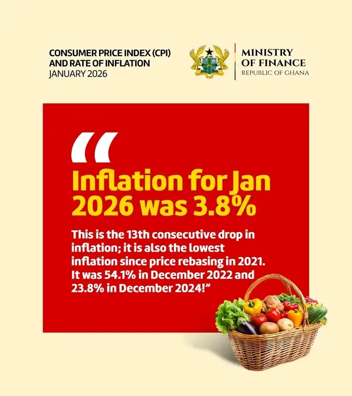 Ghana’s inflation rate has dropped to 3.8 percent in January 2026, marking the lowest level since the country’s price rebasing in 2021.