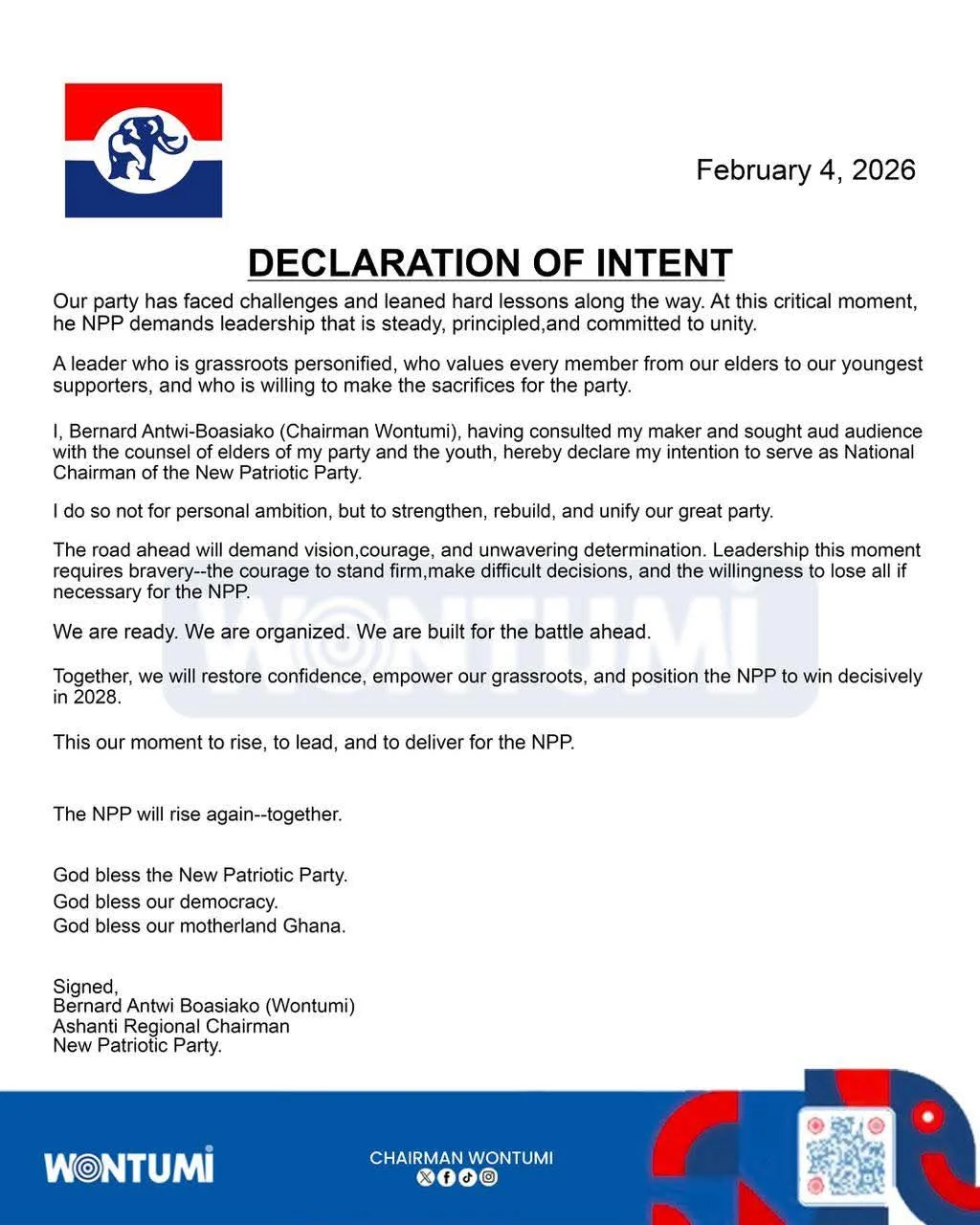 In a statement dated February 4, 2026, Chairman Wontumi said his decision follows extensive consultations with party elders and the youth, stressing the need for steady, principled, and unifying leadership at what he described as a critical moment for the NPP.