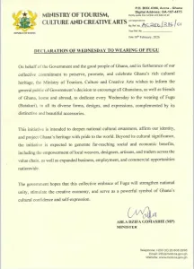 The Ministry of Tourism, Culture and Creative Arts has announced that every Wednesday will be dedicated to wearing Fugu (Batakari), a traditional Ghanaian attire, as part of a government initiative to preserve and promote the country’s rich cultural heritage.