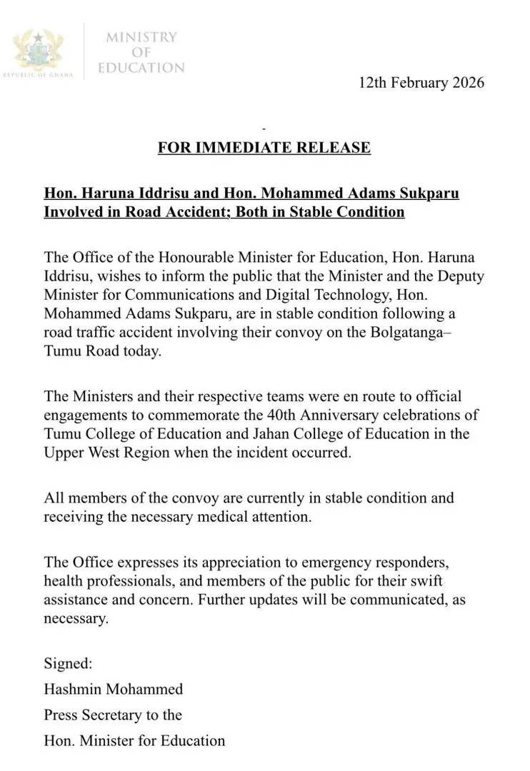 The Minister, Deputy Minister for Communications and Digital Technology, Mohammed Adams Sukparu, and their team had an accident on Thursday, February 12, 2026, while travelling in a convoy.