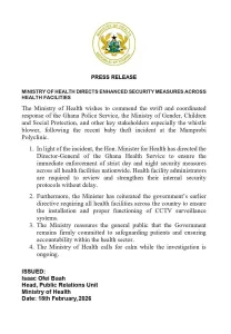 According to a statement issued by the Public Relations Unit on Wednesday, 18 February 2026, the Minister for Health, Kwabena Mintah Akandoh, has directed the Director‑General of the Ghana Health Service to enforce strict day‑and‑night security measures immediately across all health facilities nationwide.