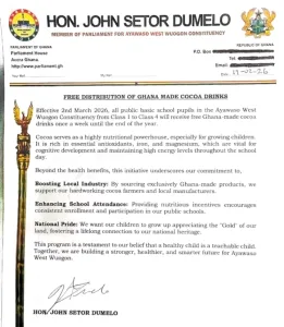 Member of Parliament (MP) for Ayawaso West Wuogon Constituency, John Setor Dumelo has announced a free distribution program of Ghana-made cocoa drinks for public basic school pupils in his constituency.