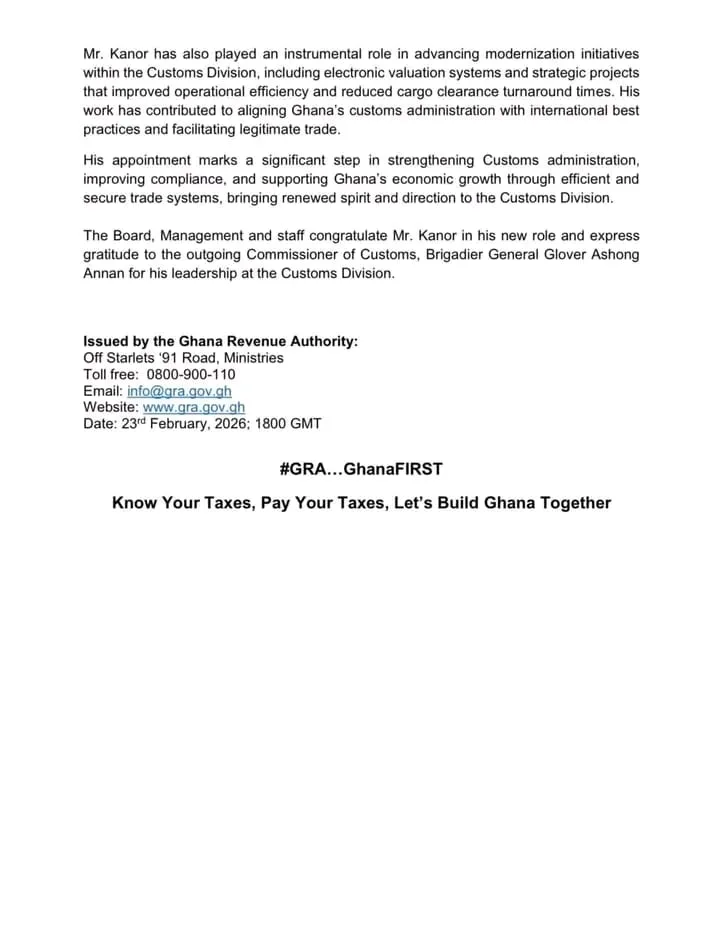 The appointment was contained in a statement issued by the GRA on Monday, February, 23, 2026, takes effect immediately due to his professional three decades of services in revenue mobilization, border security, and trade facilitation at the Authority.