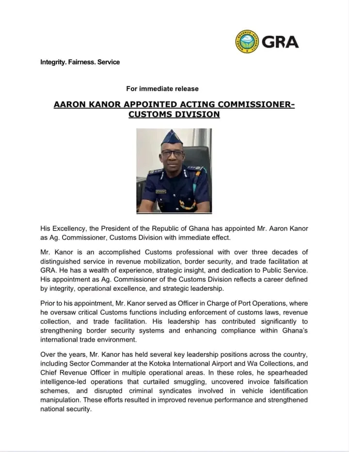 President John Dramani Mahama has appointed Aaron Kanor as Acting Commissioner of the Customs Division at the Ghana Revenue Authority (GRA)