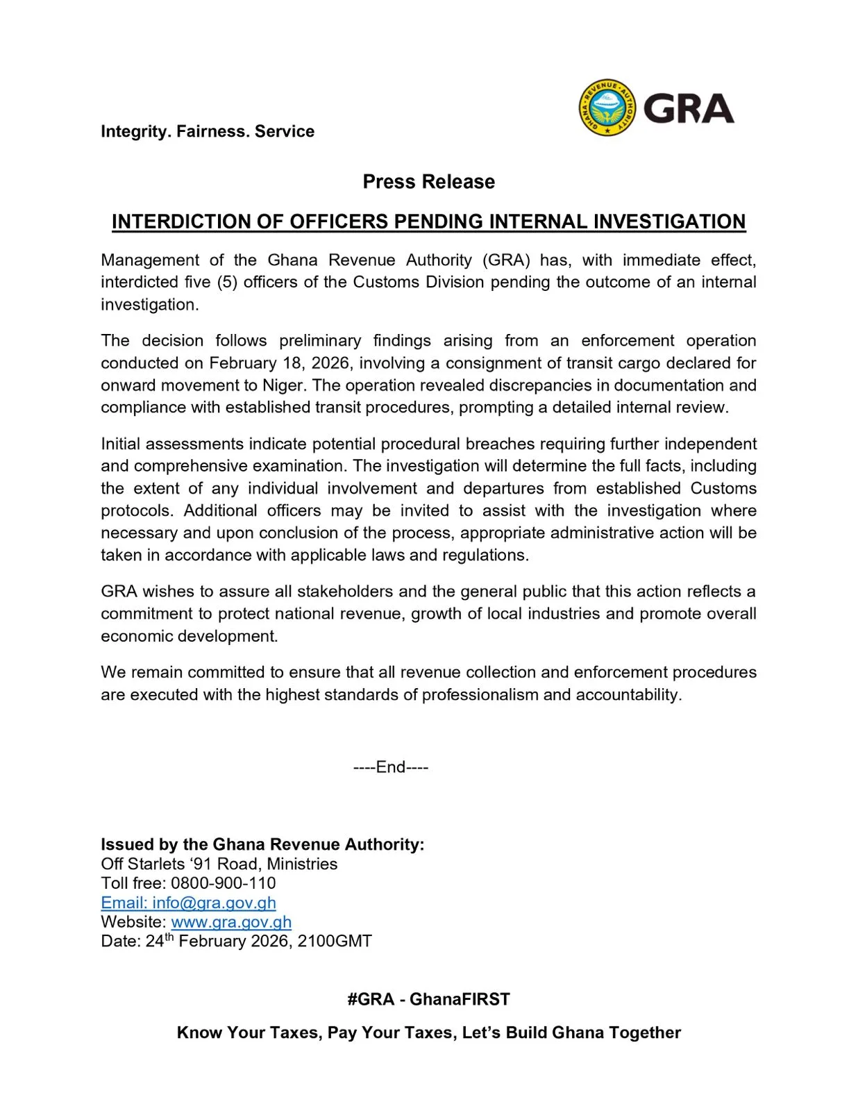 The GRA wishes to assure all stakeholders and the general public that this action reflects its commitment to protecting national revenue, fostering the growth of local industries, and promoting overall economic development.