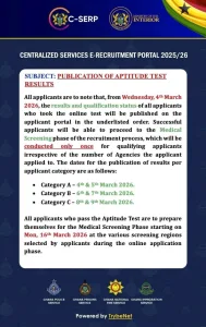 Furthermore, the Ministry stated that all applicants who pass the Aptitude Test should prepare for the Medical Screening Phase, which is scheduled for Monday, March 16, 2026, at the various screening regions selected by applicants during the online application phase.