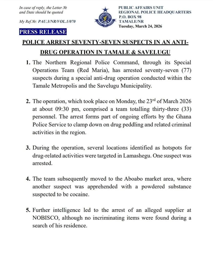 The Northern Regional Police Command, through its Special Operations Team (Red Maria), has arrested seventy-seven (77) suspects in a nighttime anti-drug operation conducted across Tamale Metropolis and Savelugu Municipality on Monday, March 23, 2026.