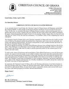 The message also warned against corruption, dishonesty, and moral compromise, urging Ghanaians to embed integrity in all public and private actions so the Easter event retains its moral significance.