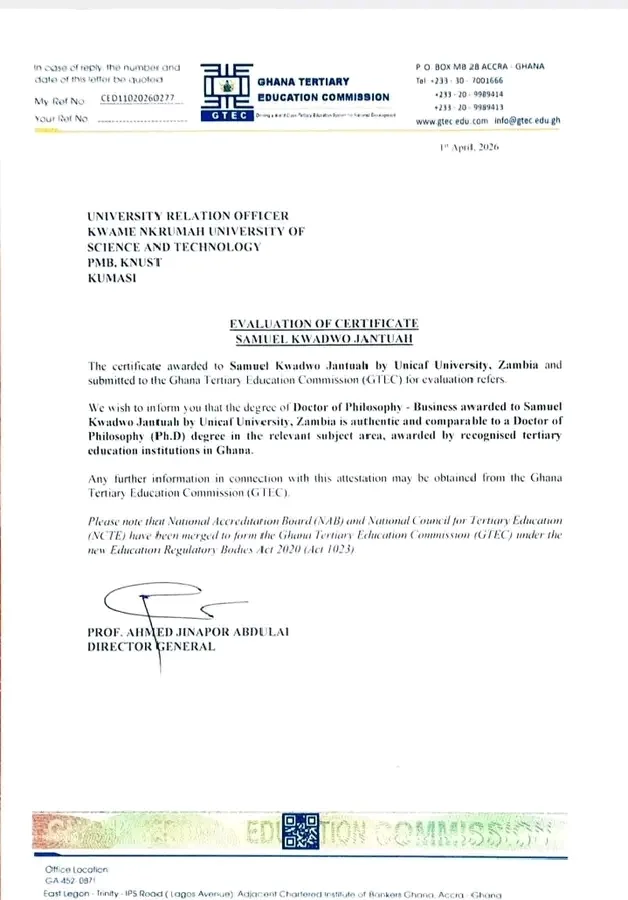 The Kwame Nkrumah University of Science and Technology (KNUST) has confirmed the authenticity of a Doctor of Philosophy (Ph.D) in Business certificate awarded to Samuel Kwadwo Jantuah by Unical University in Zambia.