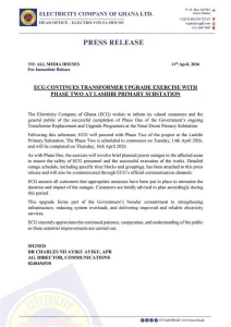 The Electricity Company of Ghana (ECG) has announced Phase Two of its transformer upgrade exercise at the Lashibi Primary Substation following the successful completion of Phase One.