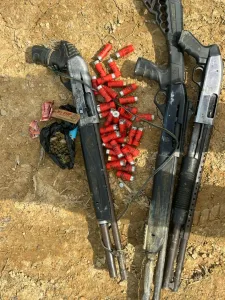 A wooden structure located approximately 45 metres from the mining site was subsequently identified and searched. The search yielded three pump action weapons along with 37 cartridges, recovered from within the structure.