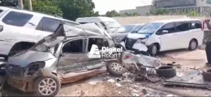 A fuel tanker carrying 54,000 litres of petrol has crashed into several used vehicles displayed at a garage for sale by the roadside at Ahodwo in Kumasi, near +2 Pub.
