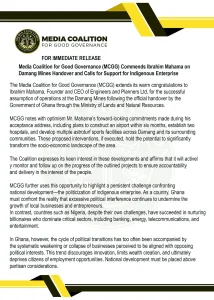 The Media Coalition for Good Governance (MCGG) has commended ths founder and Chief Executive Officer (CEO) of Engineers and Planners Ltd, Ibrahim Mahama for successfully taking over operations at the Damang Mines.