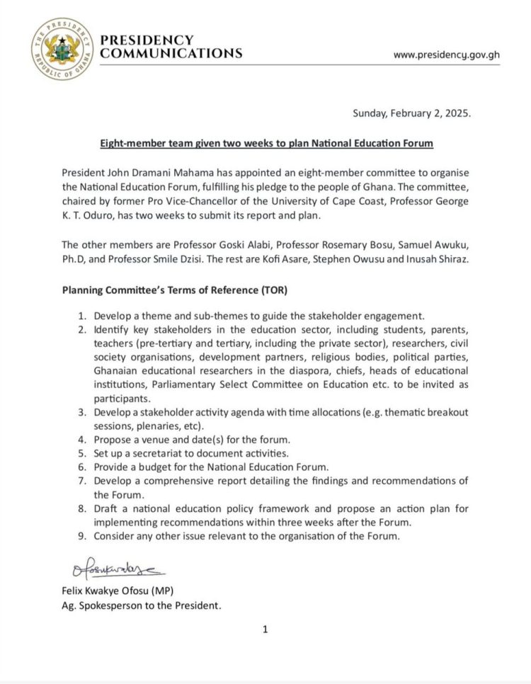 President John Dramani Mahama has appointed an eight-member committee to organise the National Education Forum, fulfilling his pledge to the Ghanaian people of transforming the sector.